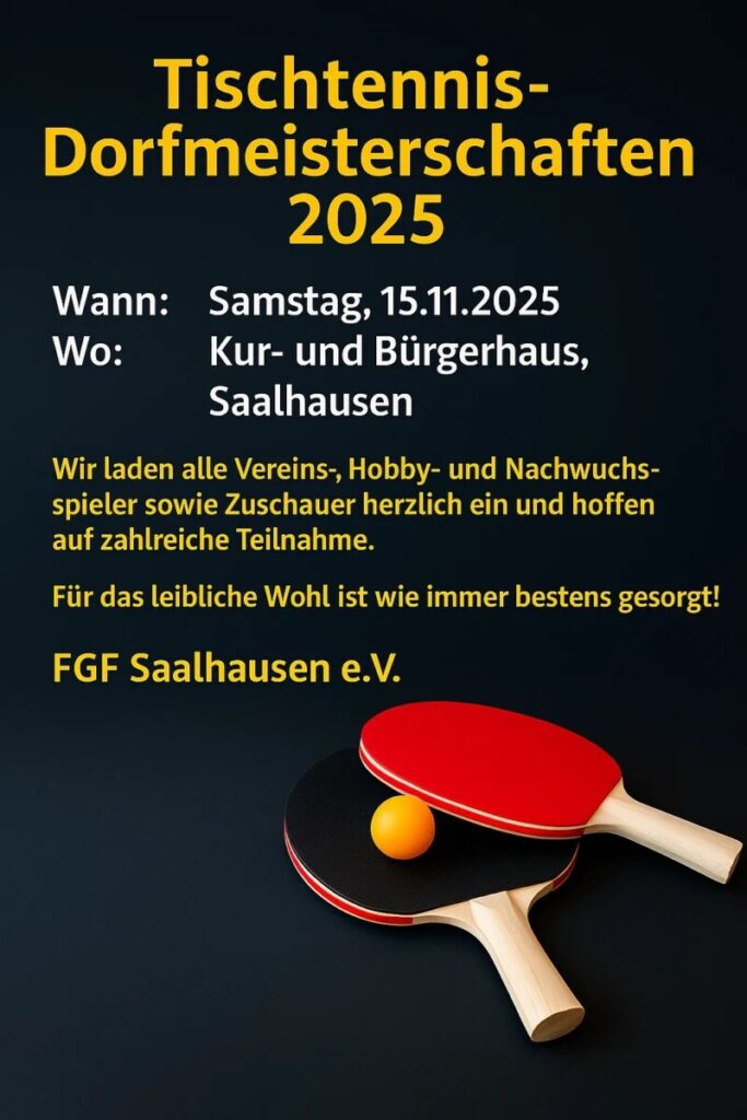 Der Förderkreis Saalhausen lädt am 15.11.2025 recht herzlich zu den Tischtennis-Dorf- und Vereinsmeisterschaften ins Kur- und Bürgerhaus Saalhausen ein.